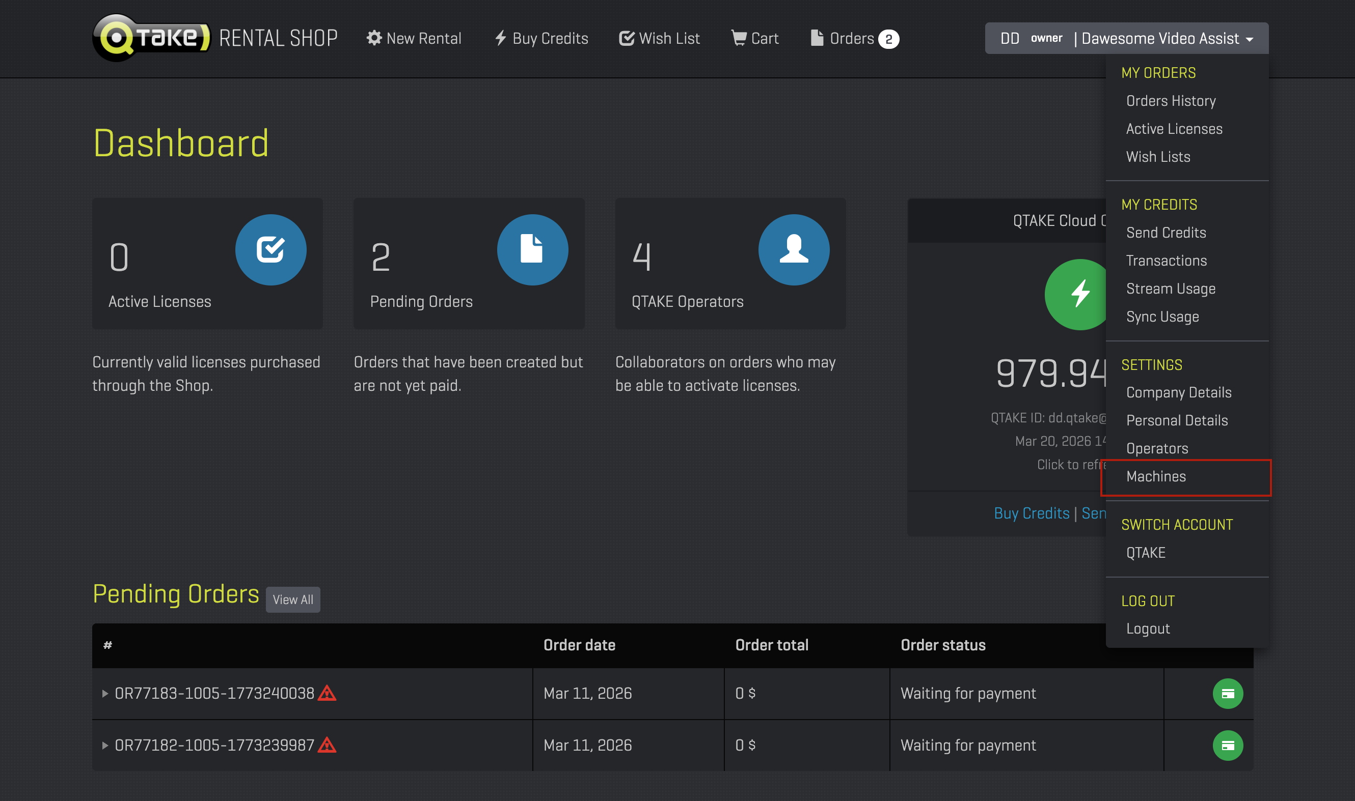 Go to QTAKE Rental Shop and log in. Click the top right menu, then Machines to display the list of machines registered under your account. Please note that starting February 2, 2026 the Machines section will only be visible to users with permanent legacy licenses. Afterwards, click Register new QTAKE Machine button on the bottom of the page.